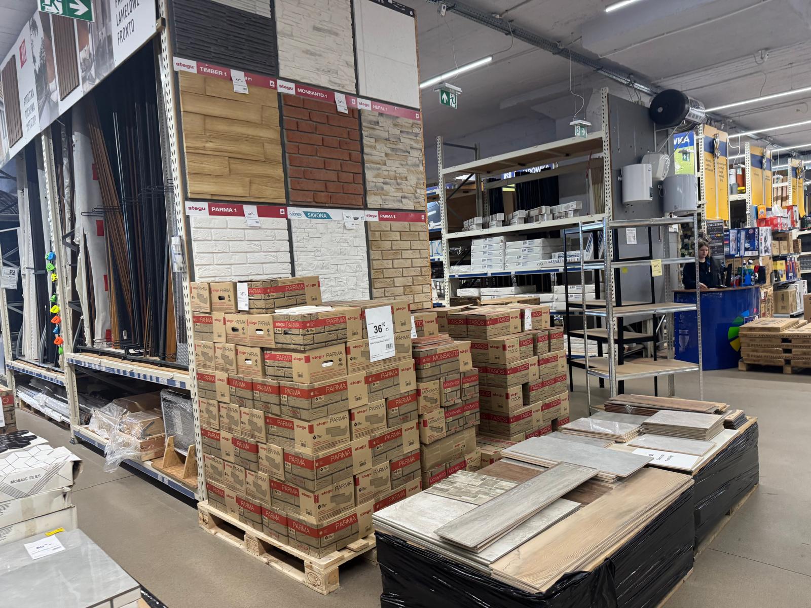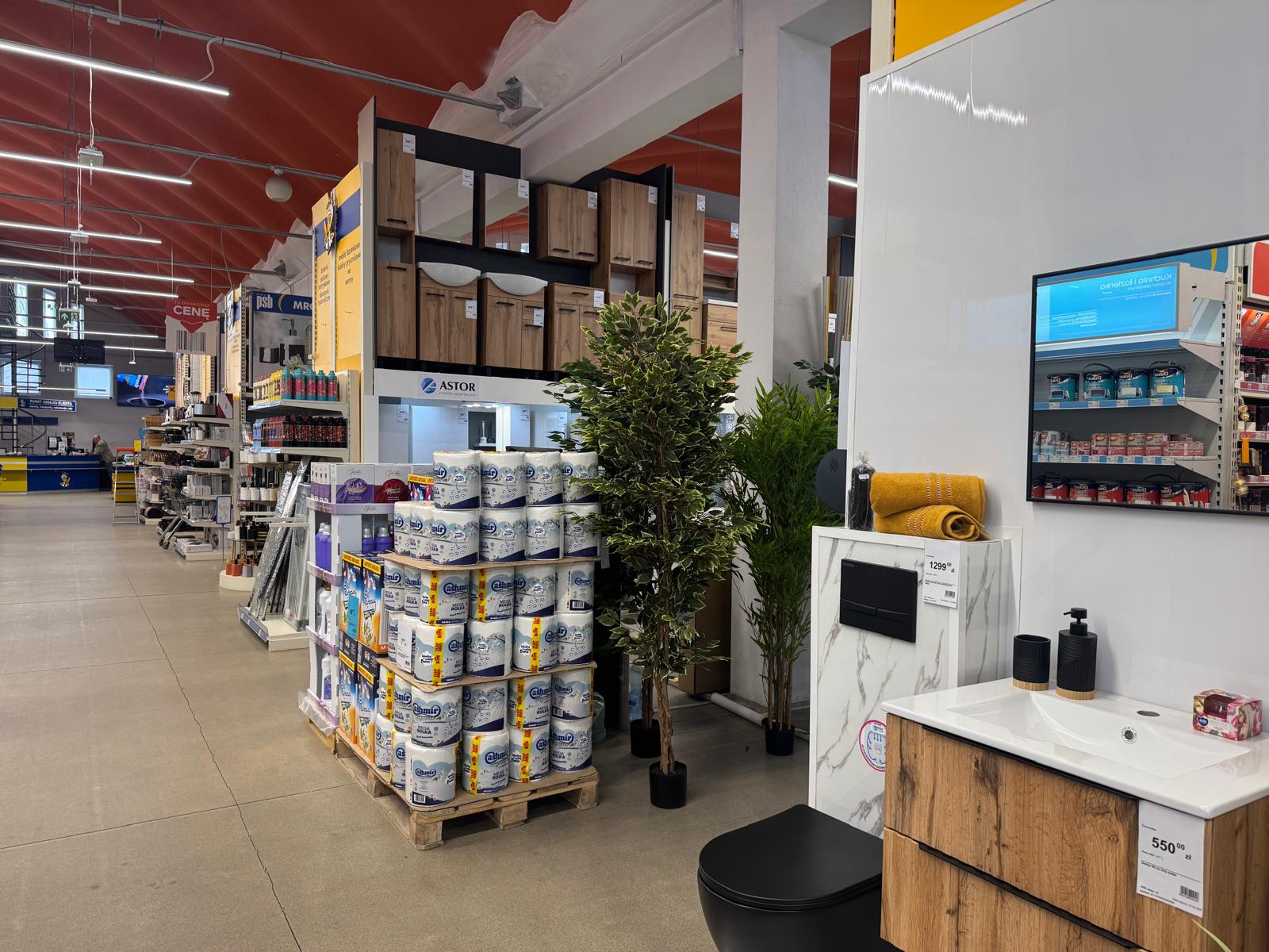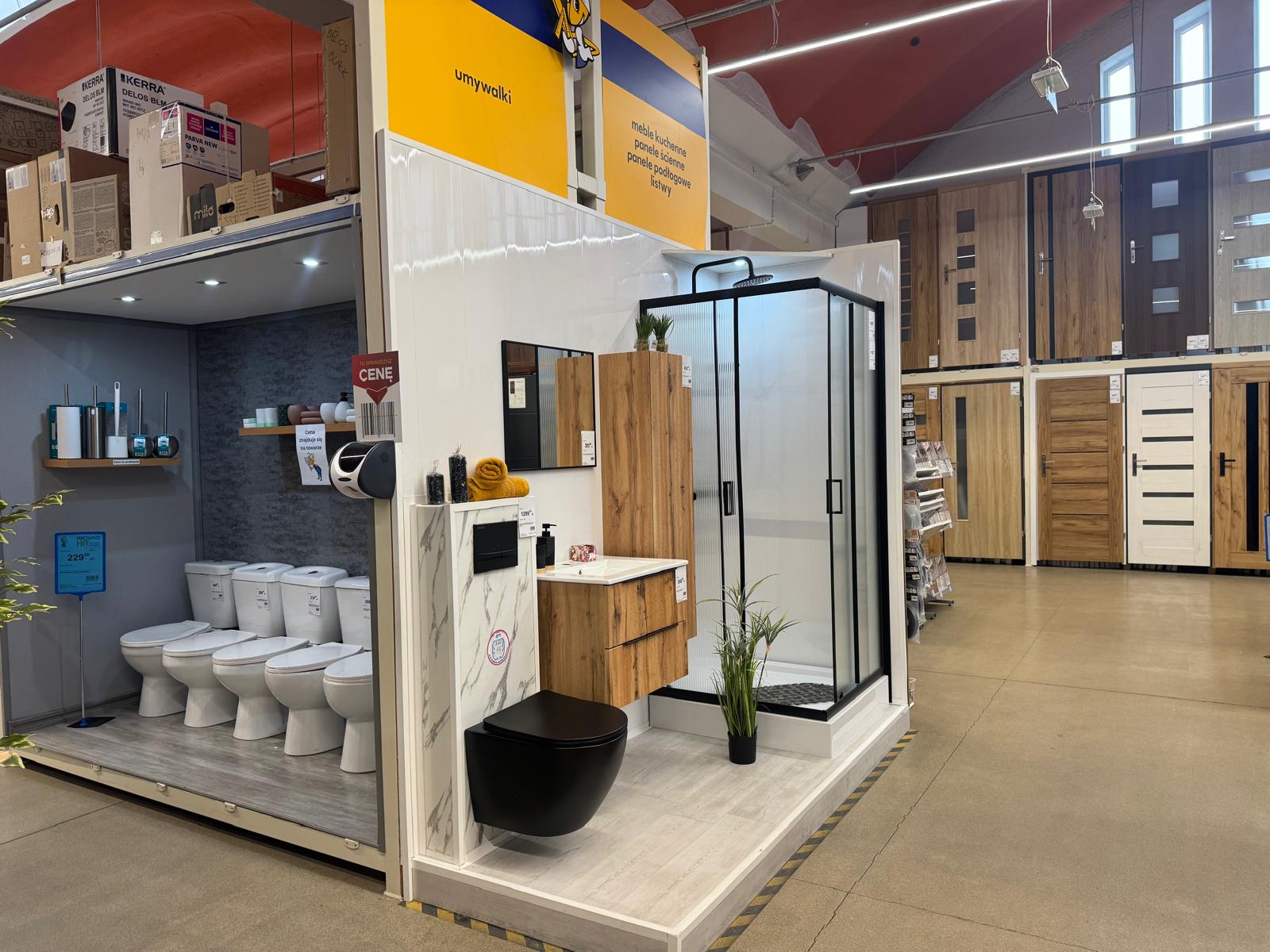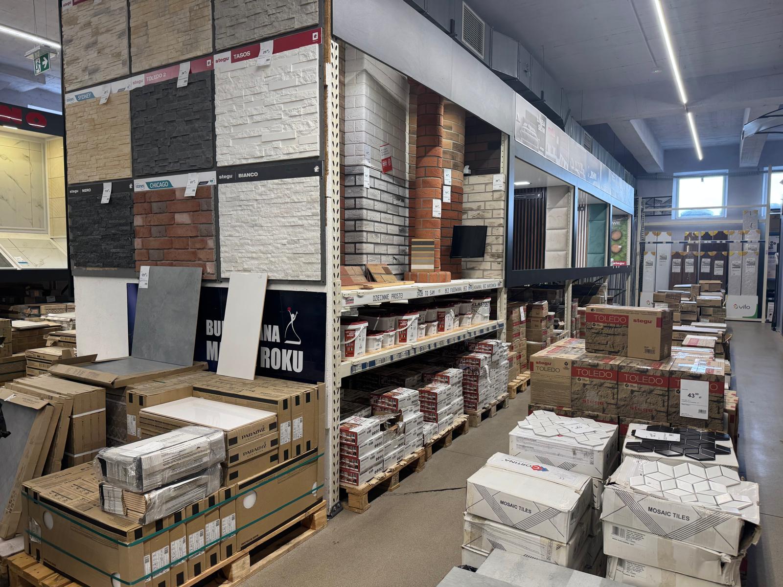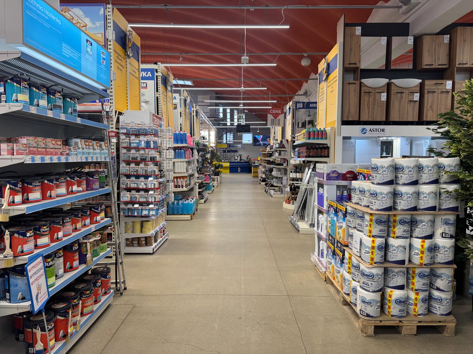 Sklep posiada w ofercie kilkanaście tysięcy pozycji asortymentowych w takich działach jak: instalacje i technika grzewcza, wentylacje, chemia budowlana i gospodarcza, płytki ceramiczne, wyposażenie łazienek i kuchni, farby, tapety, materiały wykończeniowe na podłogi i ściany, drzwi wewnętrzne i zewnętrzne, narzędzia i elektronarzędzia, artykuły oświetleniowe, elektryczne, dekoracyjne i motoryzacyjne oraz ogród i otoczenie domu. Pochodzą one od ponad 150 kontraktowych Partnerów Grupy PSB. Chcemy, aby nasi klienci mogli u nas znaleźć jak najszerszy zakres towarów potrzebnych do remontu i wykończenia.